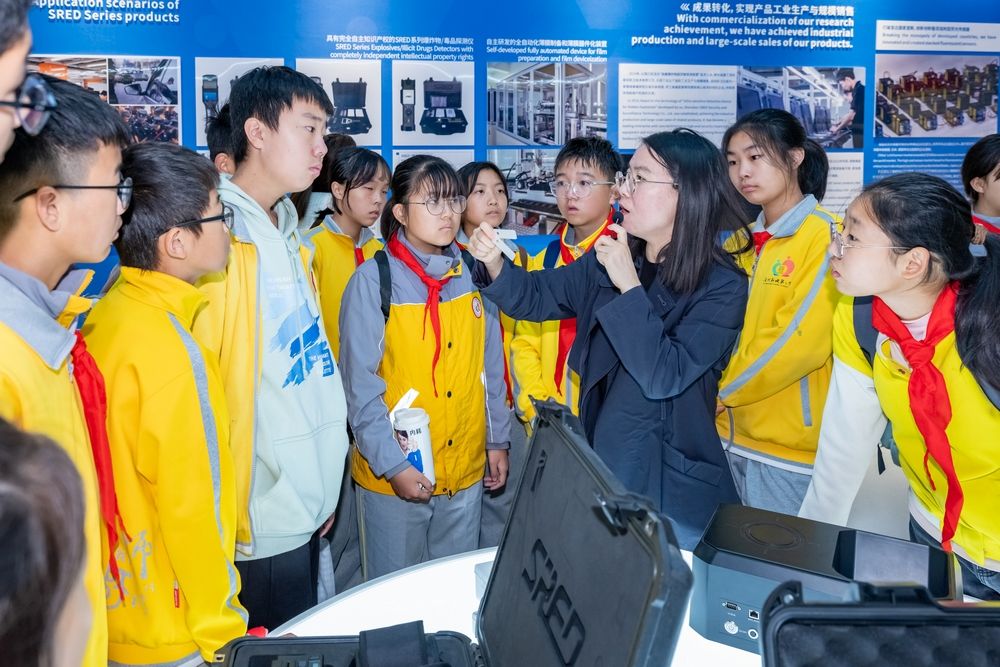 研发工程师罗艳彦向同学们介绍了研究院基本情况、科研团队、科研概况和发展理念,带领他们参观了研究院成果展厅,讲解了传感器技术在环境监测、医疗健康、国防安全等领域的重要作用,以及房喻院士团队研发的爆炸物探测仪、毒品探测仪等科研成果转化产品。