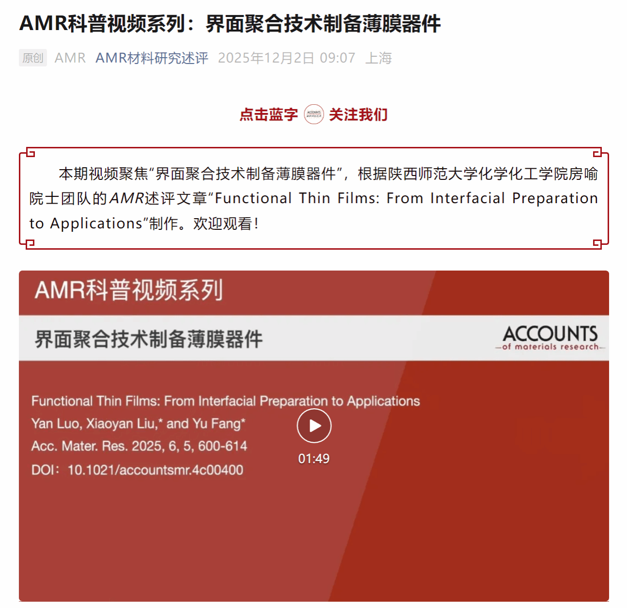 近日,Accounts of Materials Research根据陕西师范大学新概念传感器与分子材料研究院房喻院士团队的AMR述评文章“Functional Thin Films: From Interfacial Preparation to Applications”制作了一条科普视频《界面聚合技术制备薄膜器件》,并在微信公众号“AMR材料研究述评”上发布。