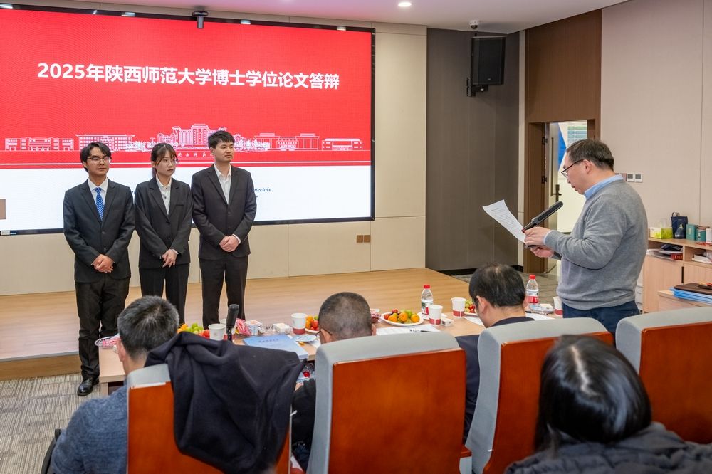 2025年12月3日,陕西师范大学新概念传感器和分子材料研究院2025届物理化学专业博士研究生林思敏、翟宾宾和刘向泉三位同学分别以《多孔荧光分子材料的构筑、光物理性质和功能应用》《柔性功能纳米膜的可控构筑及其传感应用》和《有机多孔薄膜的界面限域制备、刺激响应性及其应用》为题进行了毕业论文答辩。