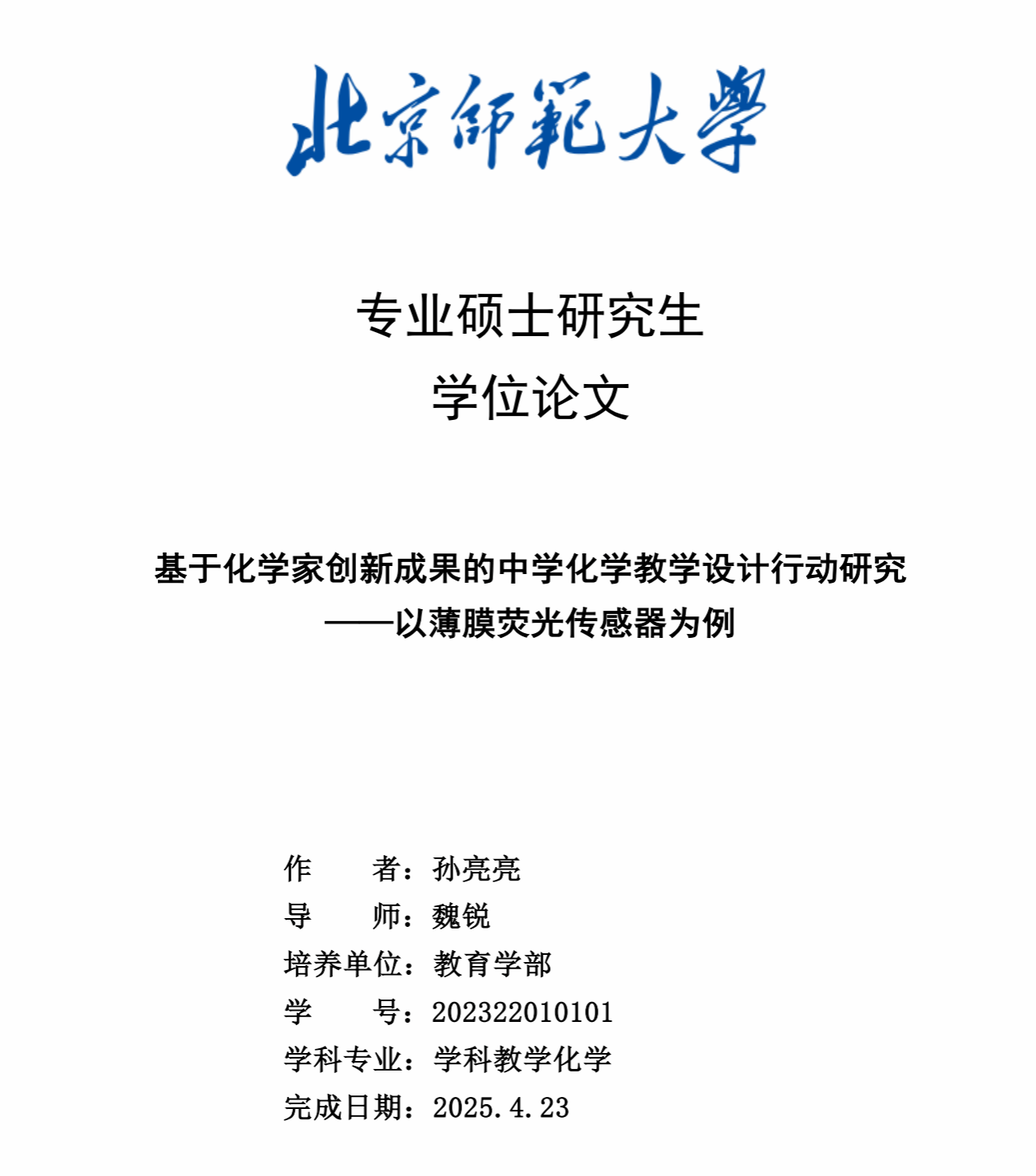 北京师范大学教育学部学科教学化学专业2023级硕士研究生孙亮亮以房喻院士团队的成果“薄膜荧光传感器”为题,开发教学资源并完成其硕士毕业论文《基于化学家创新成果的中学化学教学设计行动研究——以薄膜荧光传感器为例》。