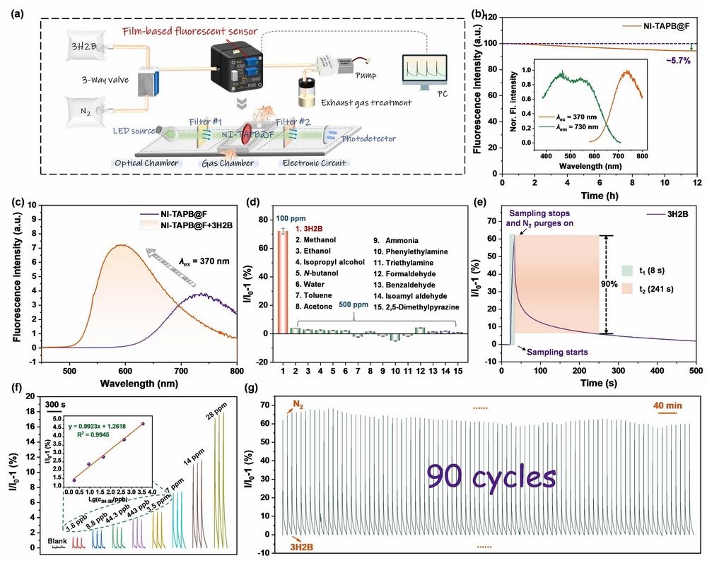 3-羟基-2-丁酮(3H2B) 是单核细胞增生李斯特菌的关键气态代谢物、一种潜在的肺癌生物标志物,也是一种广泛使用的食品风味剂,因此对其进行实时监测的需求日益凸显。本研究设计了一种水杨醛功能化的1,8-萘酰亚胺衍生物(NI-OH-CHO),并将其与1,3,5-三(4-氨基苯基)苯(TAPB)在液/液界面反应,制备了NI-TAPB荧光纳米薄膜。该薄膜经去质子化后(NI-TAPB@F),对3H2B表现出可逆且前所未有的荧光响应。