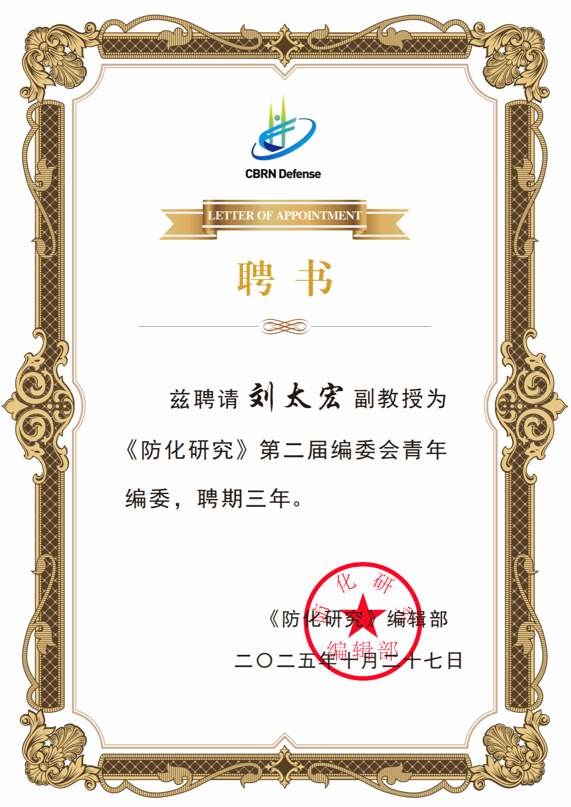 2025年11月1日上午,《防化研究》第二届编委会成立大会在线举行,会上房喻院士受聘为第二届编委会院士顾问编委,刘太宏副教授受聘为第二届编委会青年编委,聘期三年。