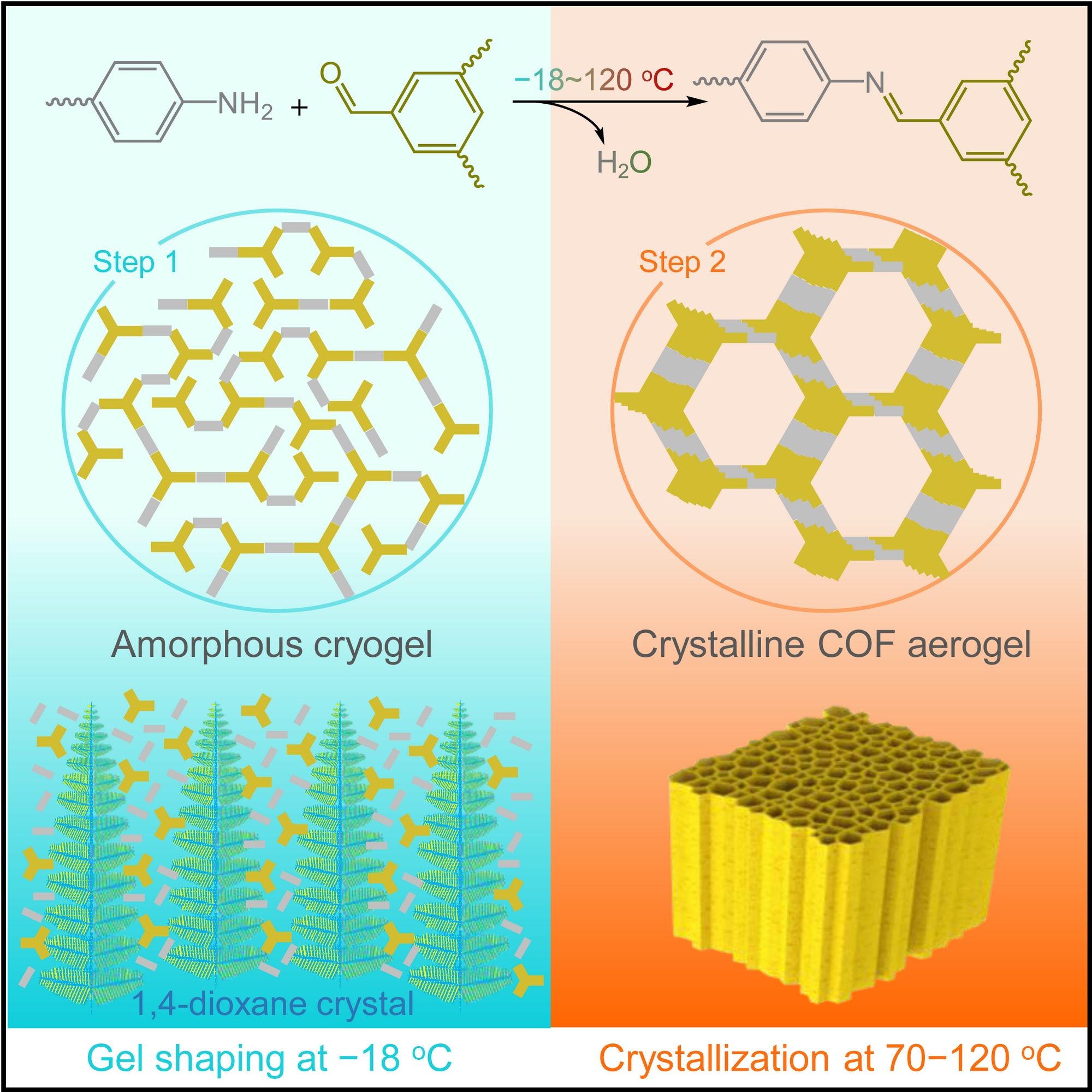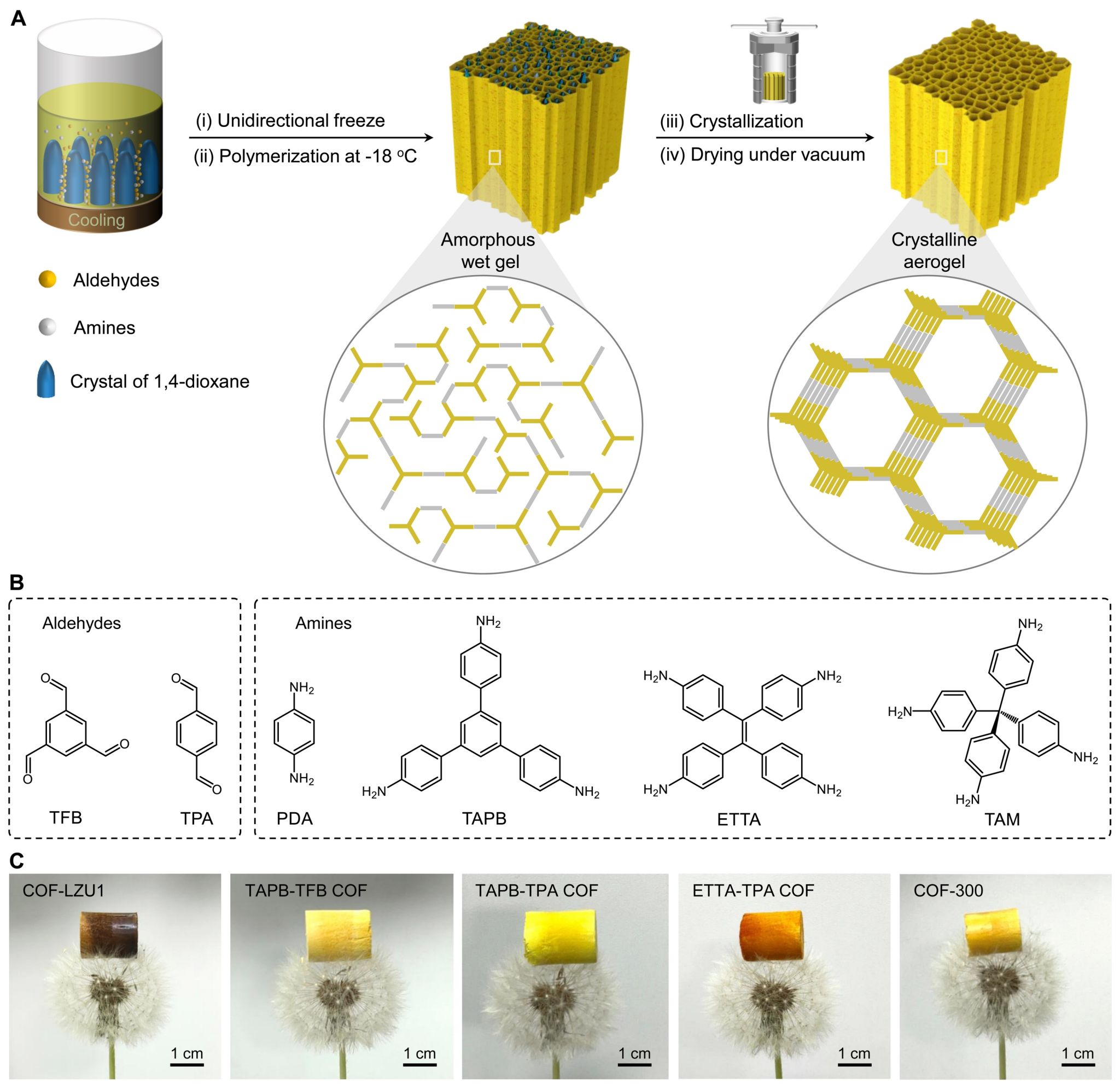 图1. 冷冻聚合辅助制备COF气凝胶示意图