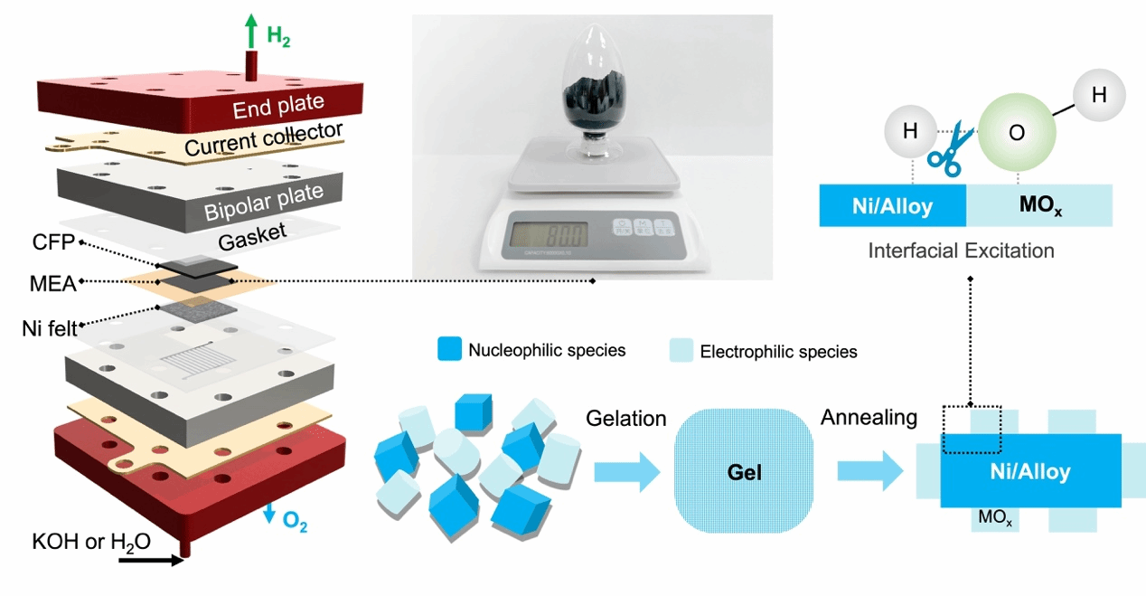 阴离子交换膜电解水技术为绿色氢气生产提供了一种实用途径。然而,碱性介质中的阴极析氢反应仍因缺乏非贵金属基高效催化剂而难以实现工业化。本研究通过凝胶法合成了一种异质结构催化剂,该催化剂结合了亲核与亲氧组分,可促进水解离并增强析氢催化性能,其特点在于N掺杂NiMo合金与MoO2颗粒间形成了丰富的界面。该异质结构催化剂在碱、中性介质中展现出卓越的析氢反应活性,与60%铂碳催化剂相当,能够实现>1 A cm-2的高电流密度并保持长期稳定性。通过AEMWE模拟显示,即使在稀释的0.1 M KOH电解质中,以1 A cm-2电流密度时电池电压仍低至1.87 V。密度泛函理论计算证实了界面激发机制:MoO2团簇与氮掺杂NiMo合金协同作用,促进水分解并优化*H吸附,从而加速氢析出动力学。本研究为规模化制备高性能、非贵金属基电催化剂提供了实用方案,适用于阴离子交换膜电解水制氢的实际应用。