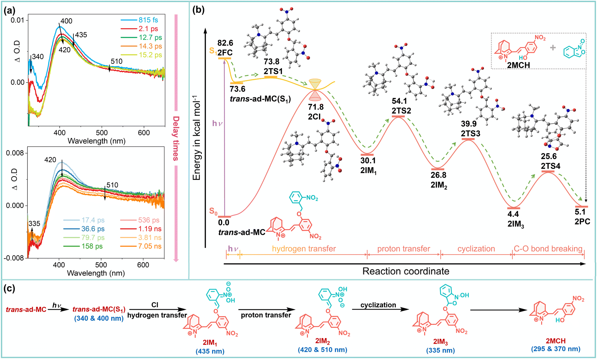 飞秒瞬态吸收光谱结合理论计算揭示了ad-MC的光化学反应机制。研究表明,ad-MC的光解笼反应通过连续的氢原子转移、质子转移、环化和C-O键断裂过程。