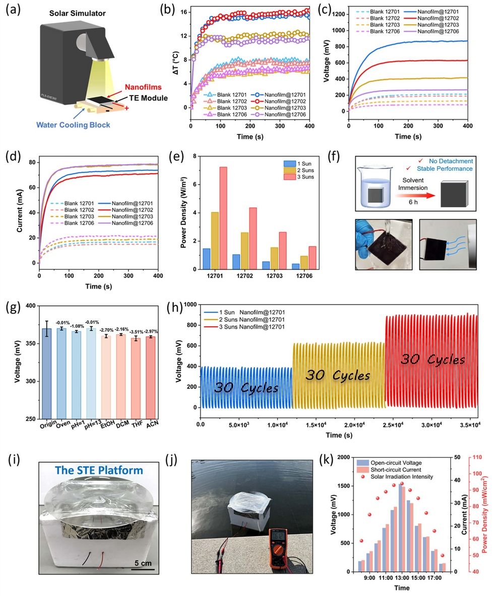 图2. (a)光热发电装置的示意图。(b–d)平衡温度、开路电压和短路电流。(e)实际最大输出功率。(f–h)稳定性测试。(i–j)搭建的用于实际场景的装置示意图。(k)实际场景下的性能测试。