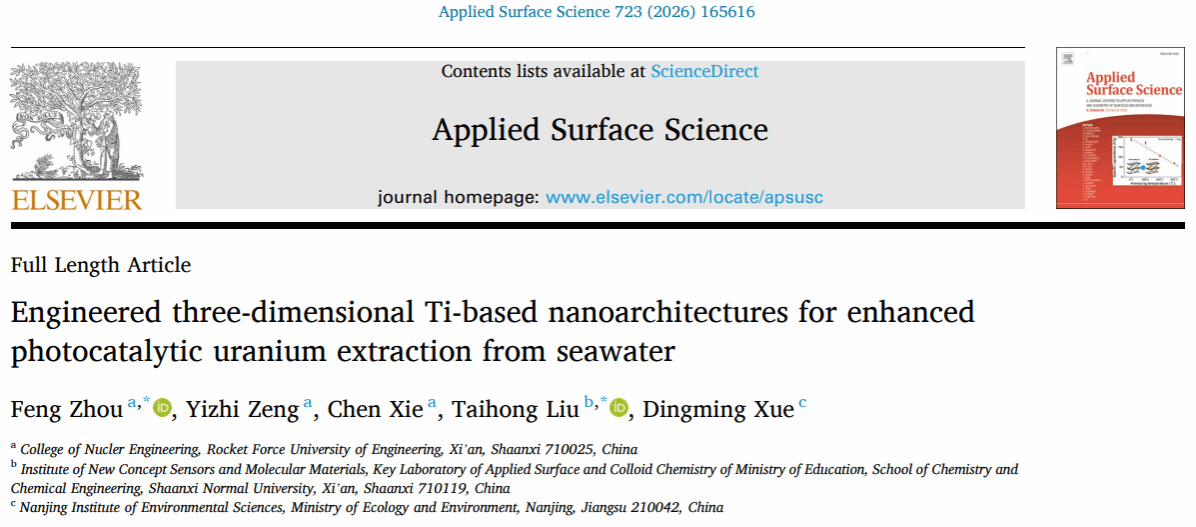 铀资源是核电可持续发展的基础。鉴于陆地铀矿相对稀缺,从储量丰富的海水中提取铀已成为一种绿色、可持续且前景广阔的替代方案。光催化铀提取技术因其快速提取动力学与固有的防污能力受到广泛关注,钛基材料因其对铀的强亲和性、高稳定性及低成本成为极具吸引力的候选材料。本工作报道了一种在钛网上原位构建的由二氧化钛纳米管与MIL‑125钛基金属有机框架复合结构,从而形成三维钛基异质界面。这种层级结构显著扩大了有效催化界面,促进了界面电荷分离与传输,并优化了活性物种的生成与利用,共同实现了光催化铀提取性能的协同提升。所得材料在海水中表现出优异性能,光催化铀提取量达312 mg·g-1,同时具备出色的循环稳定性。经过10次循环后仍保持90%的提取效率,并对微生物污染、有机污染物及竞争性吸附离子展现出强耐受性。本工作为海水提铀高效光催化剂的结构设计与性能优化提供了机理认知与研究借鉴。
