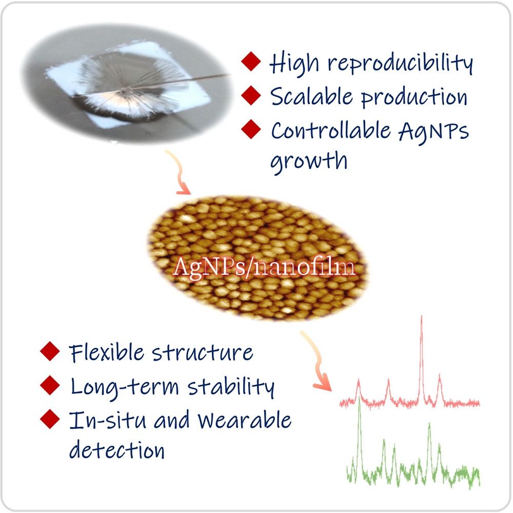 基于之前的研究成果,我们设计了一种具有多孔结构、高表面能和动态共价键网络的独立式纳米膜,它可作为空间限域反应模板。通过精确控制薄膜孔隙内的银离子和还原剂的扩散及反应动力学,我们实现了银纳米颗粒(AgNPs)的均匀且可控生长,制备出了具有高“热点”密度和牢固界面作用的AgNPs/纳米膜衬底。得益于纳米膜的合理结构设计,该衬底具有高增强因子、高灵敏度、出色的信号均匀性、卓越的稳定性、机械耐久性和化学耐受性。此外,当与手持式拉曼光谱仪结合使用时,该衬底能够可靠地对水果表面的农药残留和汗液中的代谢物进行原位检测,展示了其在复杂实际应用中快速、准确检测的潜力。这项工作为制备用于现场检测的高性能、柔性SERS衬底,提供了一种通用、可扩展的材料和工艺策略。