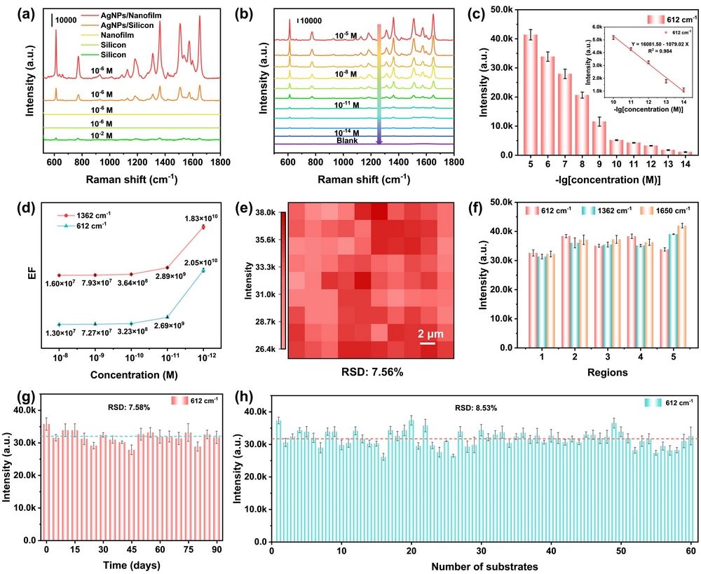 图1. AgNPs/纳米膜衬底的SERS性能。