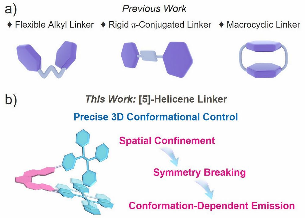 有机发光材料的性能与分子构象、分子内运动以及固态堆积方式密切相关。尤其对于聚集诱导发光(AIE)体系而言,如何有效限制分子内旋转、振动等非辐射衰减过程,是提升发光效率和实现性能调控的关键。二聚体体系因其结构明确、便于研究发色团间相互作用,已成为探究构象—性能关系的重要模型。然而,传统柔性链、刚性芳基或大环连接基虽然能够在一定程度上调节发色团间距与耦合方式,却往往难以实现精确的三维构象控制。相比之下,[5]螺烯兼具刚性、手性和显著空间位阻,不仅可作为连接单元,还可能充当“构象编辑器”,为发光与手性光学性质的协同调控提供新的分子设计策略。