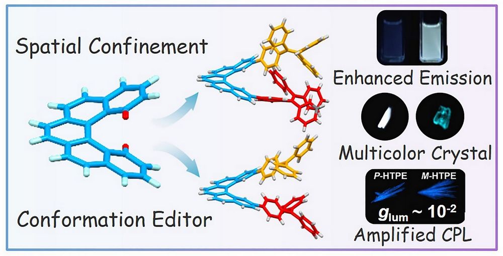 本文以刚性手性[5]螺烯作为“构象编辑器”,构建了连接四苯乙烯(TPE)和三苯胺(TPA)发光单元的二聚体HTPE与HTPA,旨在通过空间限域精确调控AIE分子的构象与发光行为。研究表明,[5]螺烯不仅是简单连接基,还能显著限制分子内运动,使二者在溶液中的荧光大幅增强:HTPE相较TPE提升约47倍,HTPA相较TPA提升约154倍。同时,螺烯提供的三维限域环境对不同体积发光单元产生差异化锁定作用:体积较大的TPE在HTPE中倾向形成不对称构象,而较小的TPA在HTPA中则保持对称构象。单晶结构与理论计算进一步证明,HTPE的不对称构象在热力学上更稳定,这种构象锁定使其形成不同晶型,并表现出可调荧光发射。进一步地,HTPE凭借螺烯赋予的手性,在晶体、聚集态及掺杂薄膜中均表现出明显的圆二色性和圆偏振发光,晶体态的glum达到10-2数量级。此外,HTPE还可作为手性供体,通过C-FRET策略将能量与手性传递给罗丹明B等受体染料,实现多色圆偏振发光。该工作为利用螺旋连接基精准调控多发色团体系的荧光与手性光学性质提供了新思路。