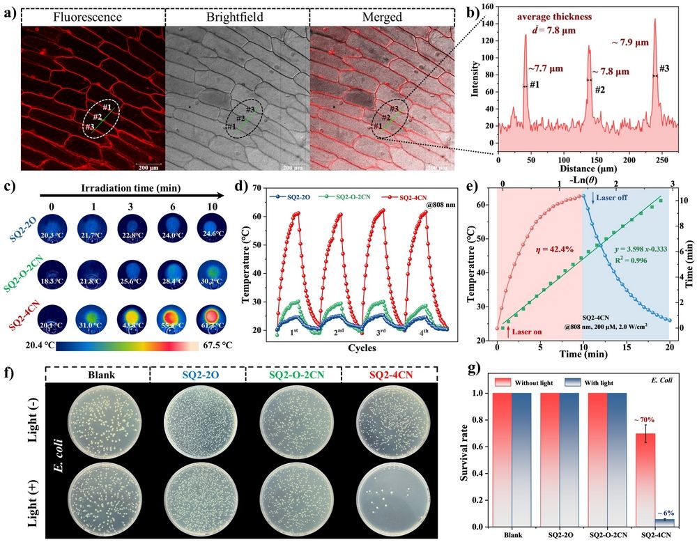 图2. (a) 与SQ2-4CN共孵育的洋葱表皮细胞的CLSM图像;(b) SQ2-4CN染色的洋葱表皮细胞的光谱强度分析; (c) SQ2系列在DMSO溶液中不同时间点激光照射下的红外热成像图;(d) SQ2系列经四次照射/冷却循环(808 nm, 1.5 W/cm2, 10分钟)的温度变化;(e) 升温/降温曲线及降温时间与–ln(θ)的关系图; (f) SQ2系列存在时对大肠杆菌菌落可视化效果比较;(g) 808 nm激光照射下与SQ2s共培养的大肠杆菌的存活率。