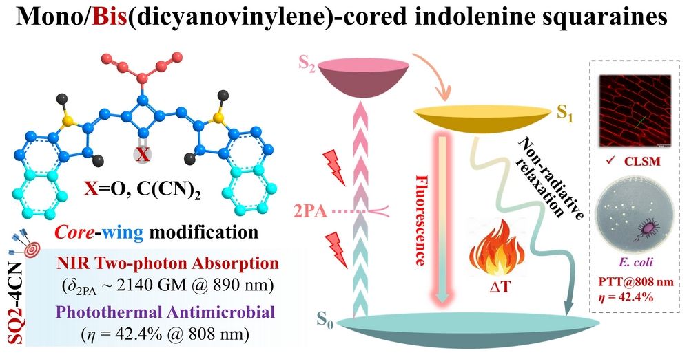 生物成像引导的光热治疗与诊断技术发展迅速,其精准性与有效性依赖于发色团和光热诊疗剂的光物理性质。在近红外发色团中,方酸菁染料因吸收带尖锐、摩尔消光系数高、光稳定性好及强双光子吸收特性而备受关注。通过π-共轭延伸和D-π-A增强策略,引入亲核杂环取代基可构建多样的“两翼”结构,优化光学性能。相较于广泛研究的给电子端基结构修饰,针对方酸菁核心的功能修饰研究较少。因此,开展“核-翼”协同修饰及其结构变化研究,是开发高性能近红外发色团与光热诊疗试剂的重要方向。