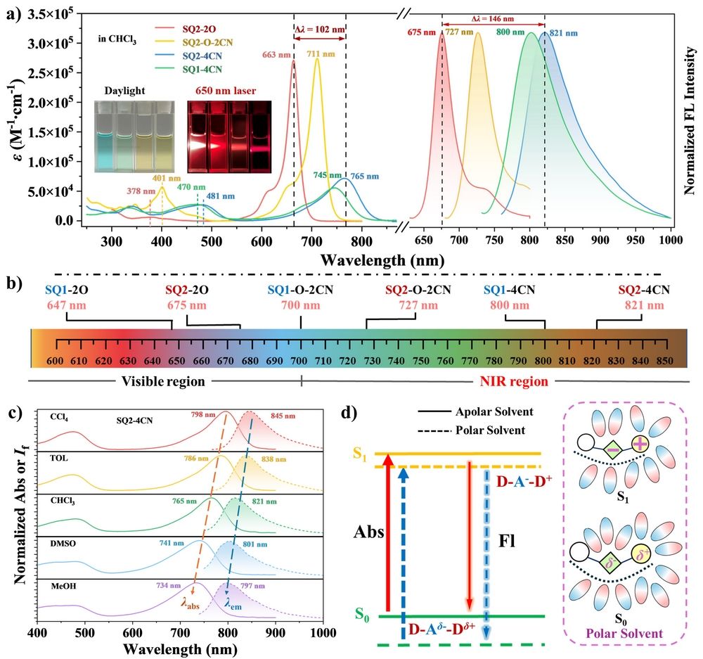 图1. (a) SQ2系列三种化合物与SQ1-4CN在CHCl3溶液中的稳态光谱;(b) 系列SQs在CHCl3中的荧光发射峰分布;(c) SQ2-4CN在不同有机溶剂中的归一化吸收(实线)和发射(虚线)光谱;(d) 溶剂极性对SQ2-4CN光激发过程的影响示意图。